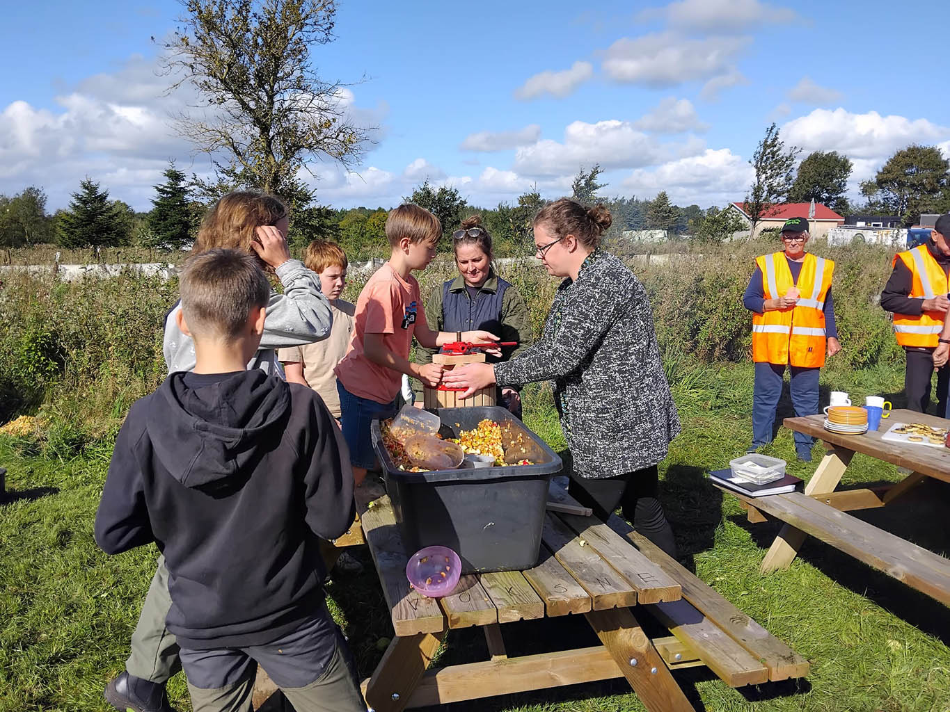 Malene fra Vild med Rebild havde sit æblemost udstyr med og der blev presset mange liter æblemost og drukket lige så mange.
